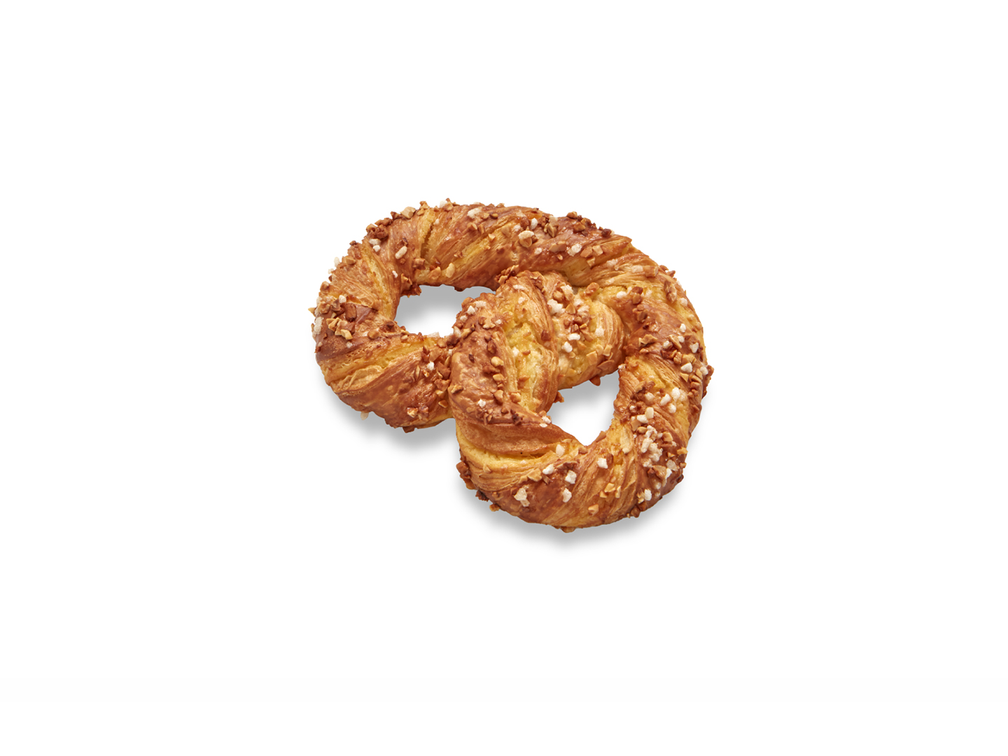 Típico Bretzel de origen alemán, de gran tamaño, crujiente por fuera, con una suave crema por dentro y cubierto con trocitos de almendras