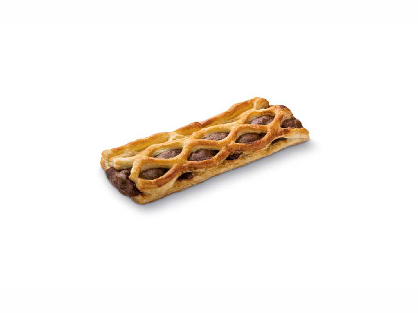 Danish de chocolate y avellanas, con masa hojaldrada y un delicado enrejado que cubre su relleno cremoso